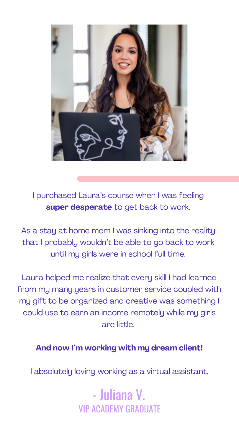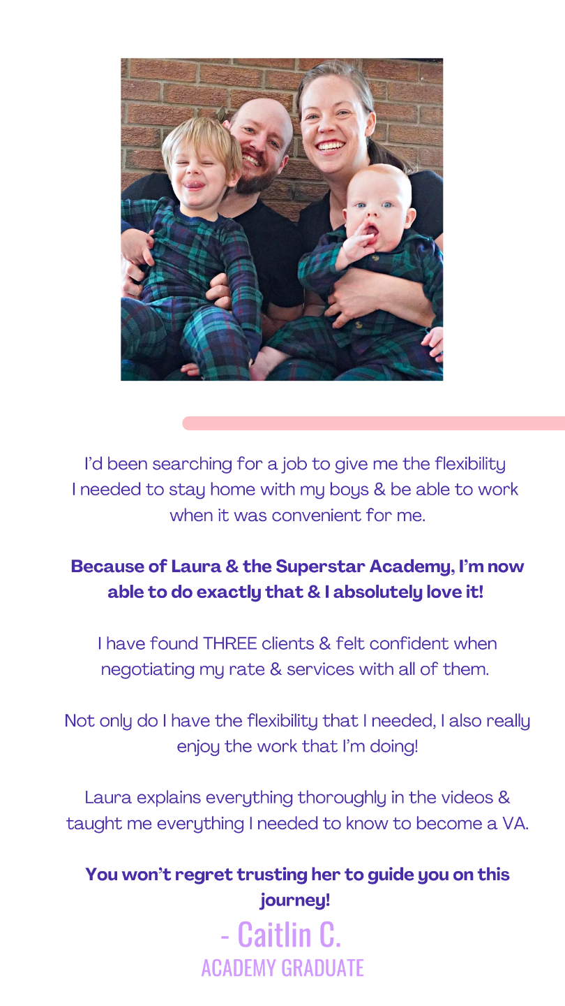 Imagine making as good of (or even better) money than your current 9-5 while still being there for your kid's milestones. That's the beauty of being a VA. The Superstar Assistant Academy streamlines the process to get your VA biz fully set up & signing your dream clients in just 28 days!