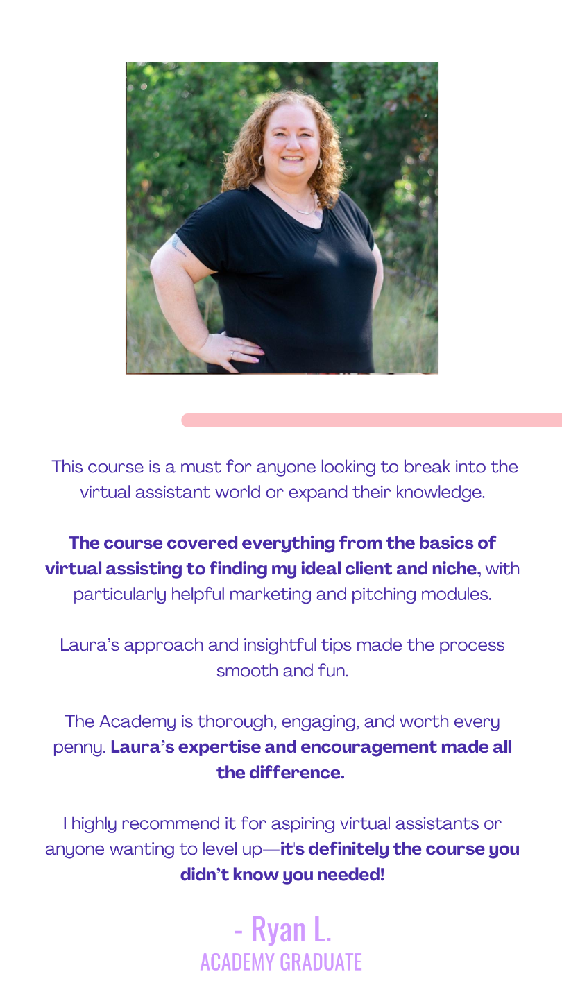 I can absolutely help you become a successful Virtual Assistant, and this FREE getting started masterclass is the first step. Listen while folding the laundry, doing school pickup, or even on a walk with your dog! These 60 mins will help you decide if becoming a VA is the right move for you.