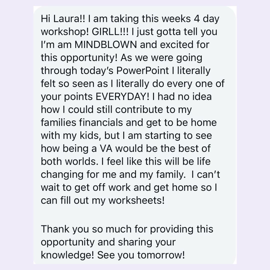 When I discovered the world of Virtual Assisting, everything shifted. I realized the skills I was already using every single day at work and at home [example: managing email, organizing schedules, communicating professionally, juggling all things admin] were the same skills small business owners would pay me $25+ per hour to do for them.
